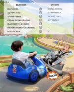 Report AbuseInnovative Design: Unlike other bumper cars, our toddler electric car features large wheels giving it the ability to drive outdoors easily. This creative design sets it apart from other ride-on bumper cars, enhancing play-time variety for your kids. Two Driving Modes: Enjoy the fun with two driving options—steering wheel control and a convenient remote control. This electric bumper car for toddlers offers manual control speed 2.2 mph and remote speeds ranging from 1.6 to 2.2 mph, ensuring a safe yet thrilling ride for young adventurers. Cute Personalization Options: Each bumper car for kids comes with adorable DIY stickers, allowing children to customize their ride and express their inventiveness, making each ride a creative feeling filled with fun. Perfect Size and Capacity: Measuring 27.6*21.7*18.1 inches, this baby bumper car’s capacity weight up to 66 lbs, making it an ideal ride-on bumper car for toddlers. It provides just the right balance of area and steadiness for children to enjoy. Comprehensive Features: This electric ride-on bumper car comes with Bluetooth Music and LED lights, adding excitement to every ride and improving kids’ athletical skills at the same time!