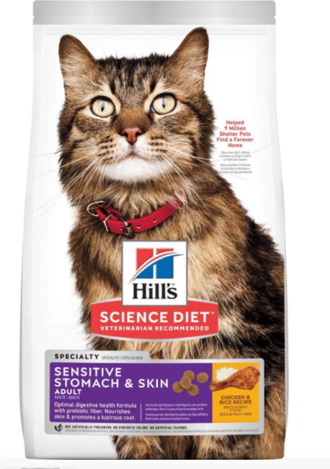 Hills Science Diet Adult Sensitive Stomach & Skin Chicken & Rice Recipe Dry Cat Food this contains an addition of nourishing prebiotic fiber that supports coat and skin. Aids in providing a better digestive system for little furry friends.