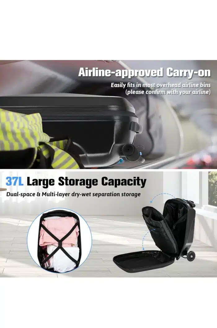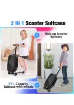 【CONVENIENCE AND LABOR-SAVING】Kids can ride it at airports or train stations and It can also serve as a daily short-distance transportation tool, such as going to subway stations or schools. It’s space-saving as it’s foldable, can be stored easily and fits in the airplane overhead bin without needing to be checked. 【SAFETY & BRAKING CONTROL】Please note that for safety reasons, the handlebar of our scooter suitcase swings less than 15 degrees to adjust the direction. Therefore, we suggest not to glide too fast and avoid making large turns. Meanwhile, there is a brake pedal at the bottom. It’s very easy to steer by turning the handgrip, allowing the child to have easy control. 【STRONG & SAFE MATERIAL】The suitcase is made of waterproof and scratch-resistant PC material, which is wear-resistant and lightweight at the same time. The scooter is made of high-quality aluminium with a maximum load-bearing capacity of 240LB. The handle and pedal are made of anti-slip materials to ensure the safety of children during use. 【ROOMY CAPACITY INTERIOR】The ride on suitcase for kids is spacious inside (37L capacity), with multiple pockets and secure straps. It has a wet and dry separation pocket. Carry-on size (22.8 x 14.2 x 11.2 in.), it fits most airline luggage racks (check with your airline).The design of the ride on suitcase for kids is very user-friendly. 【RETRACTABLE HANDLE】The button-type 3-level handle of our luggage can be adjusted to different heights. It reduces swing effect. The handle locks when extended or recessed for easy operation and to prevent damage.