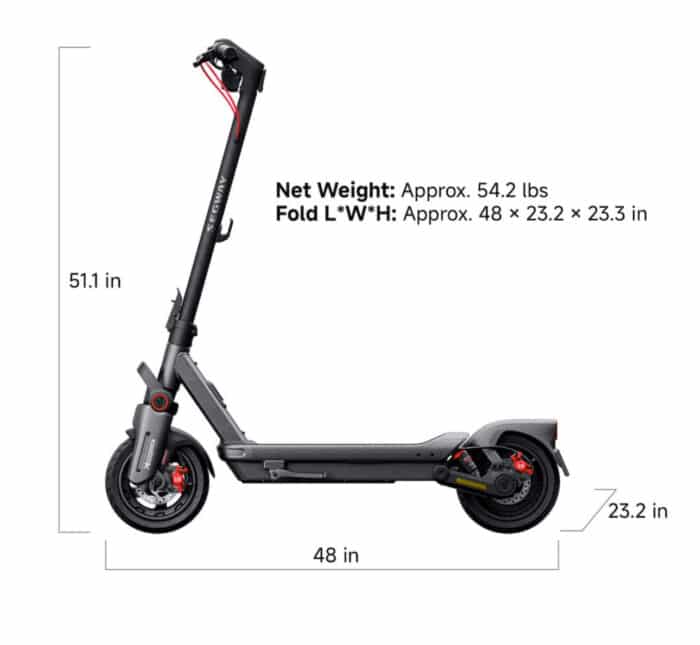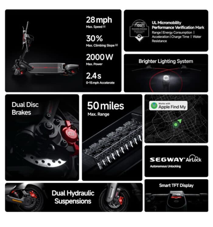 Feature Detail Top Speed 28 mph (via SegRange) Maximum Range Up to 50 miles per charge Motor Power 2,000 W motor (peak) Product Weight 54.2 lb (approx 24.6 kg) Maximum Load / Capacity 286 lb (approx 130 kg) Color / Finish Black (as listed)